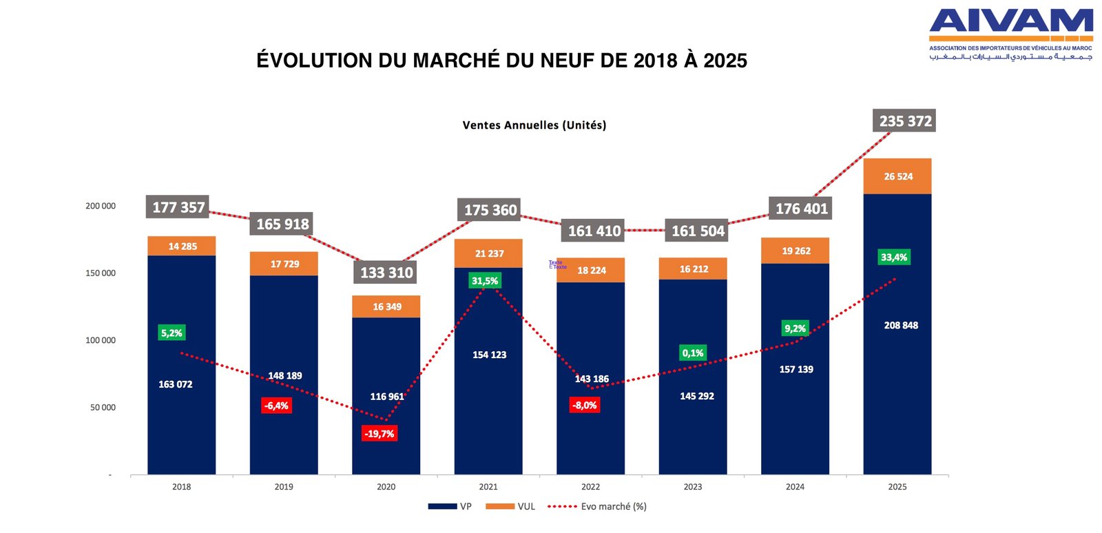 Après ces dernières années durant lesquelles il n’a connu qu’une croissance modérée, le marché national des véhicules neufs a connu une forte croissance au terme de l’année 2025. Après la comptabilisation des immatriculations neuves réalisées en décembre dernier et qui se sont chiffrées à 27.354 unités, les ventes totales de 2025 ont atteint 235.372 véhicules, soit une hausse de 33,43 % comparativement aux 176.401 unités écoulées sur l’année 2024. Tels sont les principaux chiffres à retenir des statistiques officielles recueillies par l’Association des importateurs de véhicules neufs au Maroc (Aivam), qui ont été annoncées lors de la conférence de presse annuelle, tenue traditionnellement vers la mi-janvier.